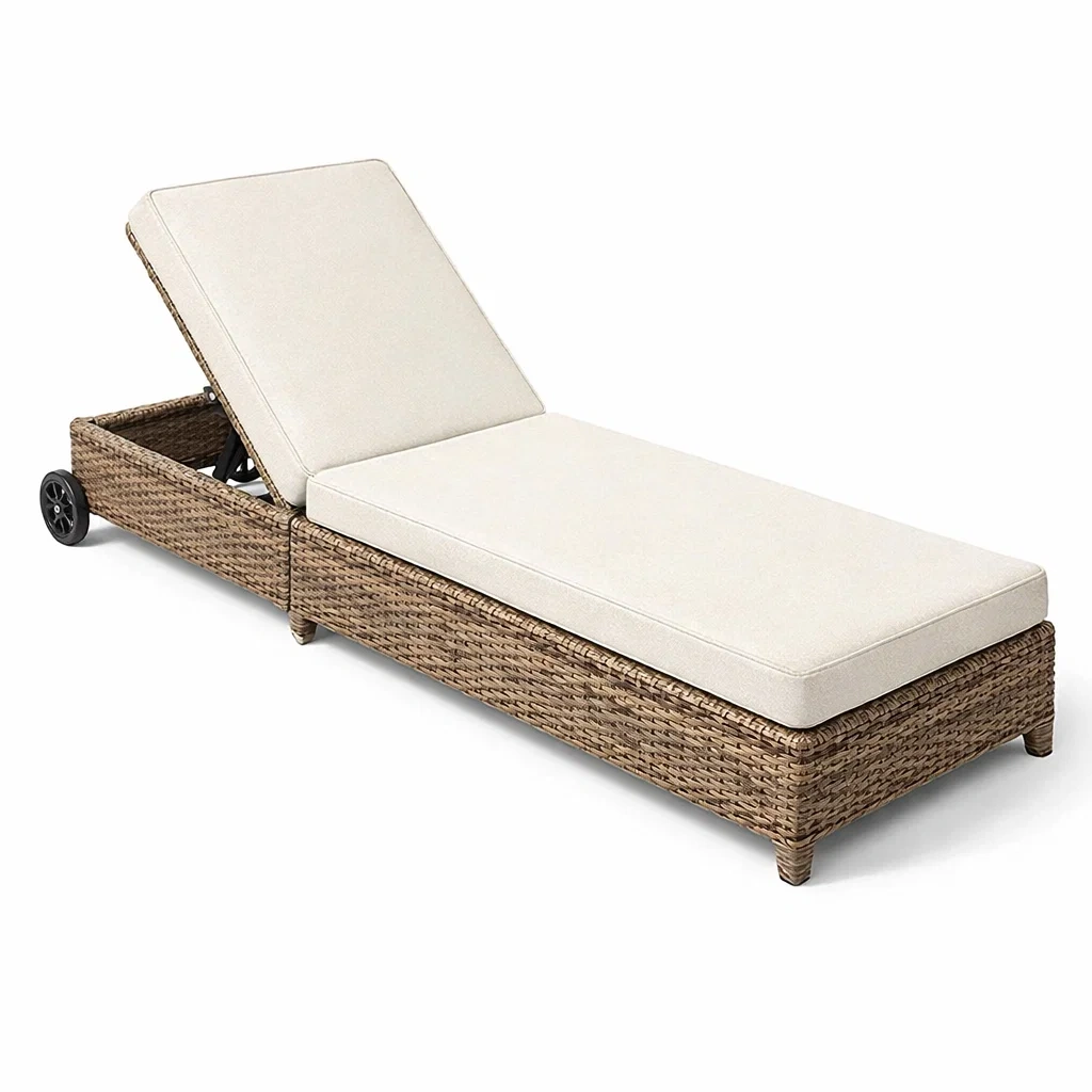 Cette chaise longue est fabriquée en résine tressée avec un coussin rembourré en mousse polyuréthane. Elle mesure 200 cm de longueur, 65 cm de largeur et 35 cm de hauteur. Le dossier est inclinable et les roulettes intégrées permettent un déplacement facile. Le produit est résistant aux intempéries, idéal pour une utilisation extérieure. Il est conseillé de la ranger à l'intérieur lorsqu'elle n'est pas utilisée et de la nettoyer avec un chiffon humide.
